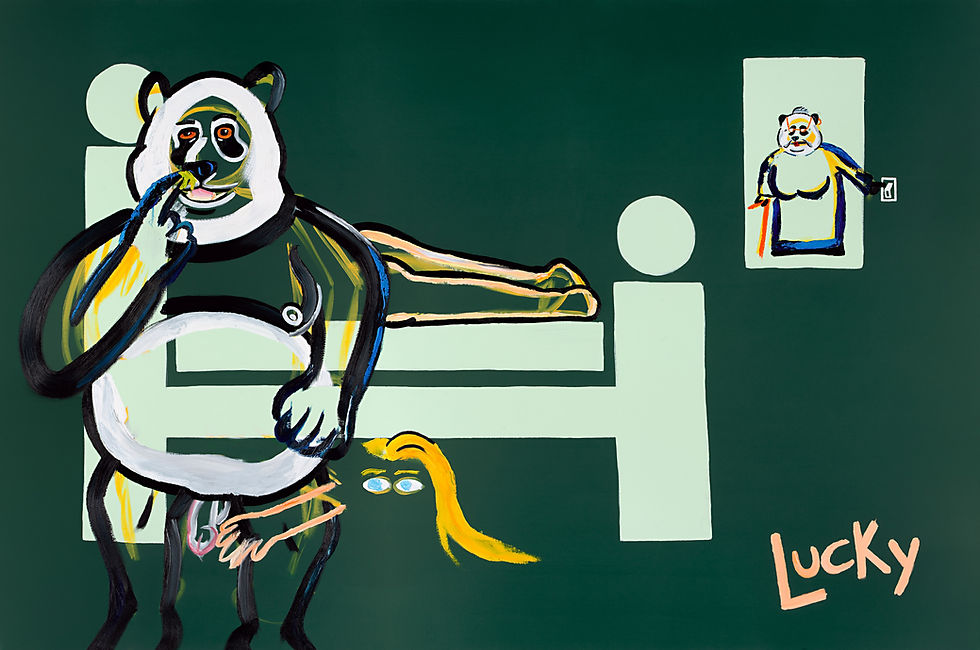 Combining pop-art flatness with anthropomorphic characters, Lucky explores contemporary anxieties in a way that is both jovial and deadly serious. Bold and bright, and slightly disconcerting, we see his subjects navigating everyday scenarios in unusual ways.